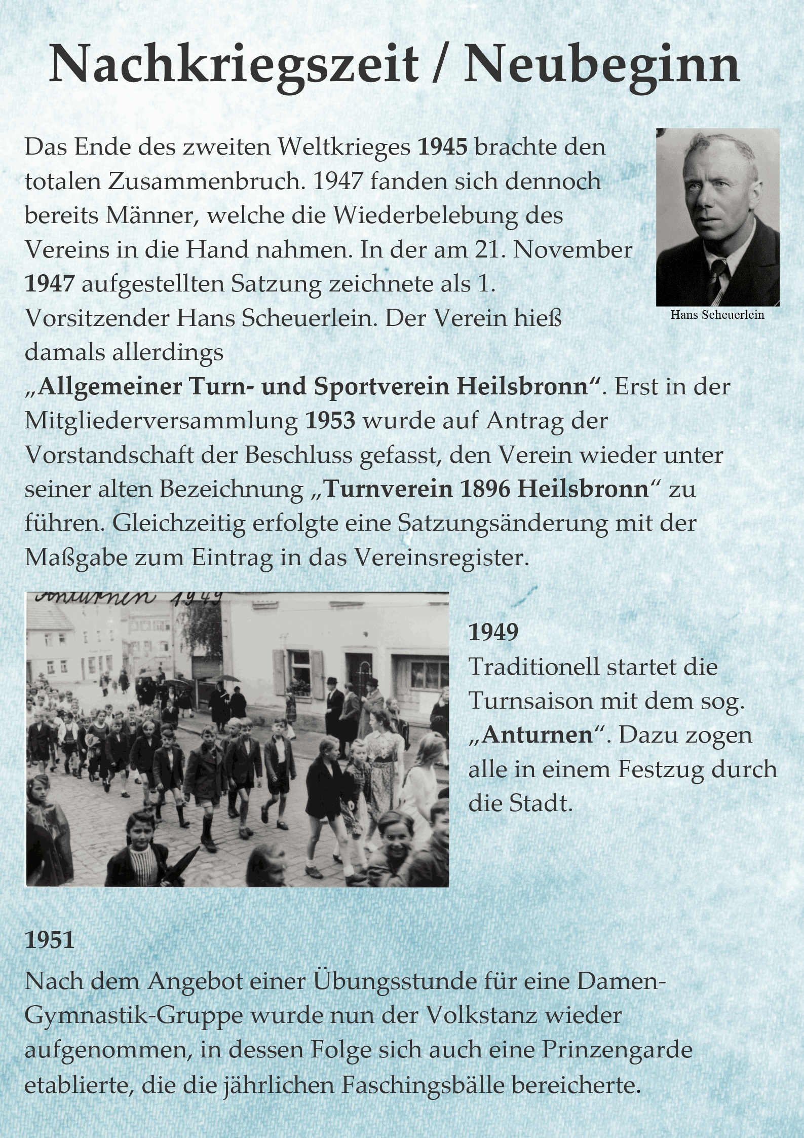 Das Ende des zweiten Weltkrieges 1945 brachte den totalen Zusammenbruch. Dennoch fanden sich bereits 1947 Männer, welche die Wiederbelebung des Vereins in die Hand nahmen. In der am 21. November 1947 aufgestellten Satzung zeichnete als 1. Vorsitzender Hans Scheuerlein. Der Verein hieß damals allerdings „Allgemeiner Turn- und Sportverein Heilsbronn„. Erst in der Mitgliederversammlung 1953 wurde auf Antrag der Vorstandschaft der Beschluss gefasst, den Verein wieder unter seiner alten Bezeichnung „Turnverein 1896 Heilsbronn“ zu führen. Gleichzeitig erfolgte eine Satzungsänderung mit der Maßgabe zum Eintrag in das Vereinsregister.