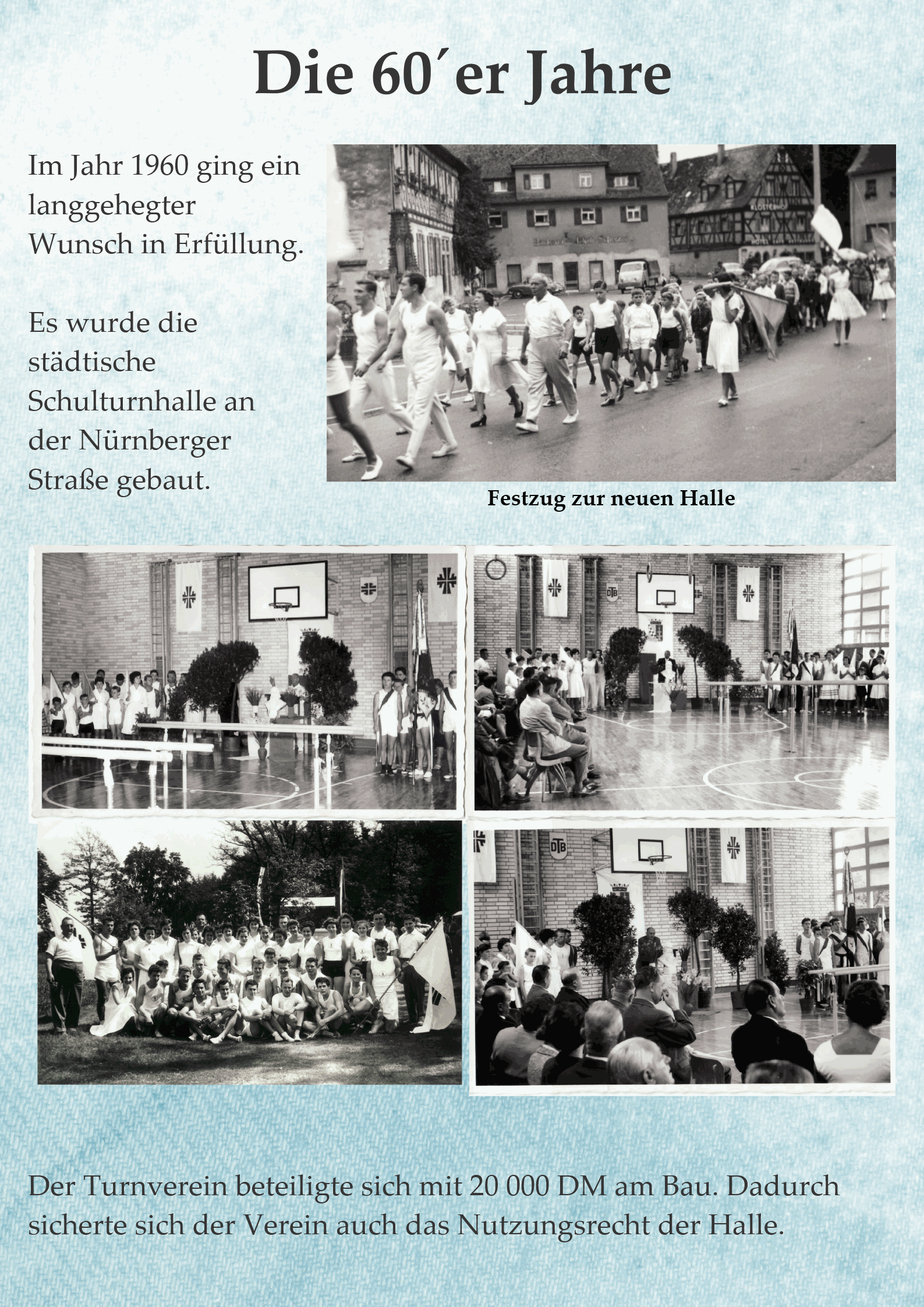 Im Jahr 1960 ging ein langgehegter Wunsch in Erfüllung. Es wurde die städtische Schulturnhalle an der Nürnberger Straße gebaut. Der Turnverein beteiligte sich mit 20 000 DM am Bau. Dadurch sicherte sich der Verein auch das Nutzungsrecht der Halle.