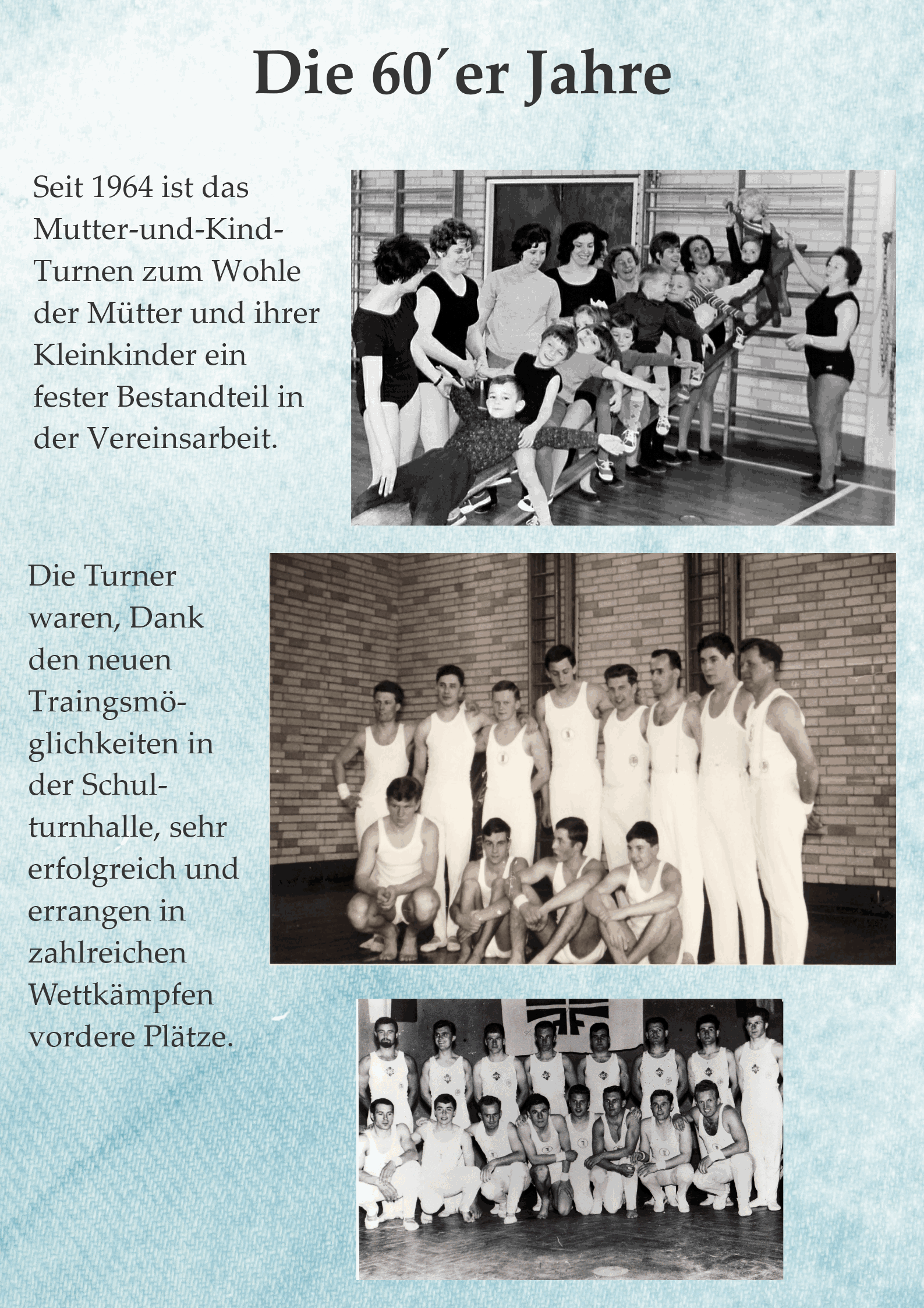 Seit 1964 ist das Mutter-und-Kind-Turnen zum Wohle der Mütter und ihrer Kleinkinder ein fester Bestandteil in der Vereinsarbeit. In diesem Zusammenhang muss eine Frau genannt werden, der nicht nur diese Initiative zu verdanken ist, Frau Maria Neumann. Ihr Idealismus, verbunden mit einer starken Persönlichkeit, machten sie zu einer Institution im Verein.