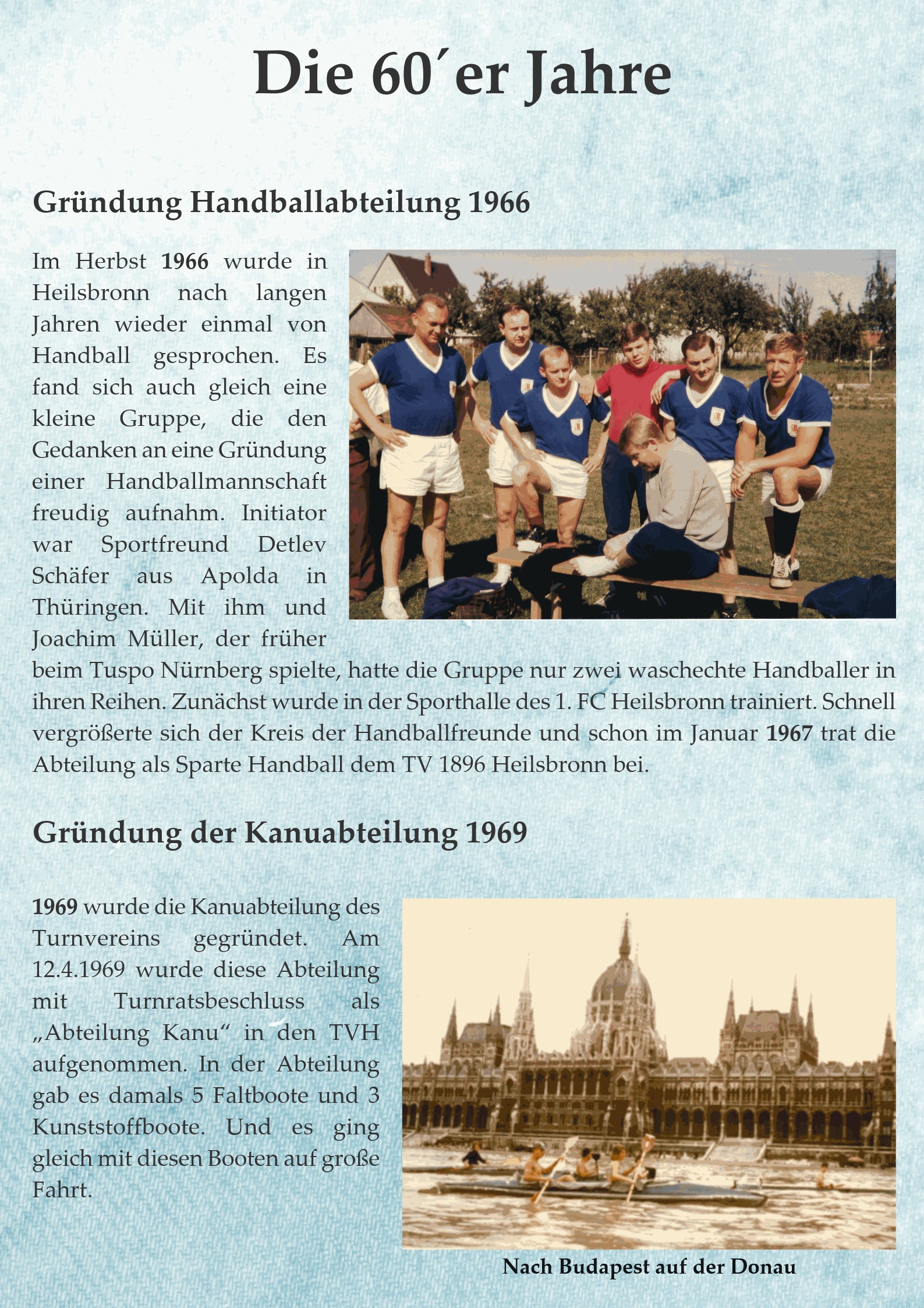Am 8.3.1969 wurde die Kanuabteilung des Turnvereins gegründet. Am 12.4.1969 wurde diese Abteilung mit Turnratsbeschluss als „Abteilung Kanu“ in den TV 1896 Heilsbronn e. V. aufgenommen und ab dem 1.4.1969 somit gleichzeitig in den Deutschen Kanuverband (DKV), um damit in den Schutz der Sportunfallversicherung zu gelangen.