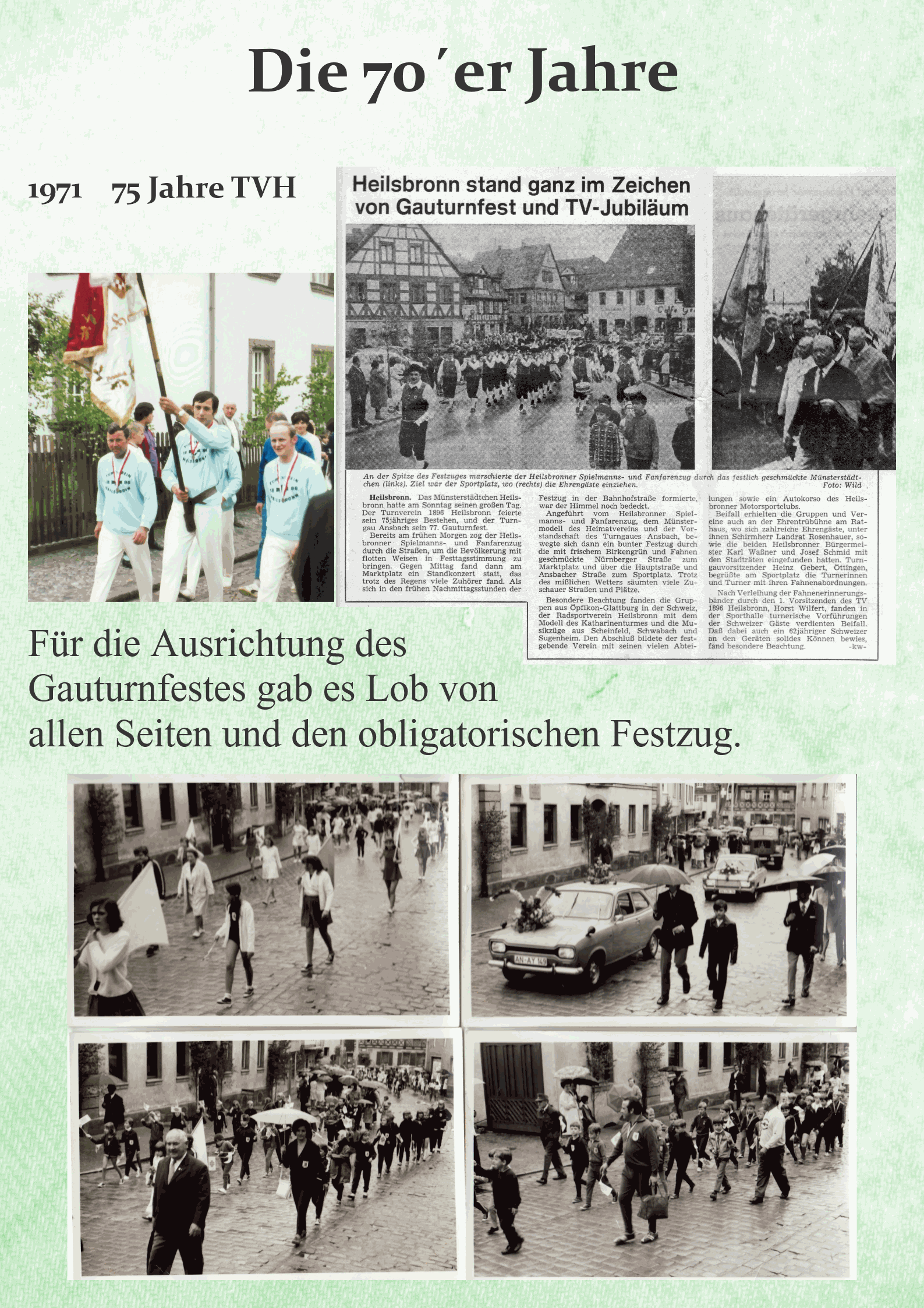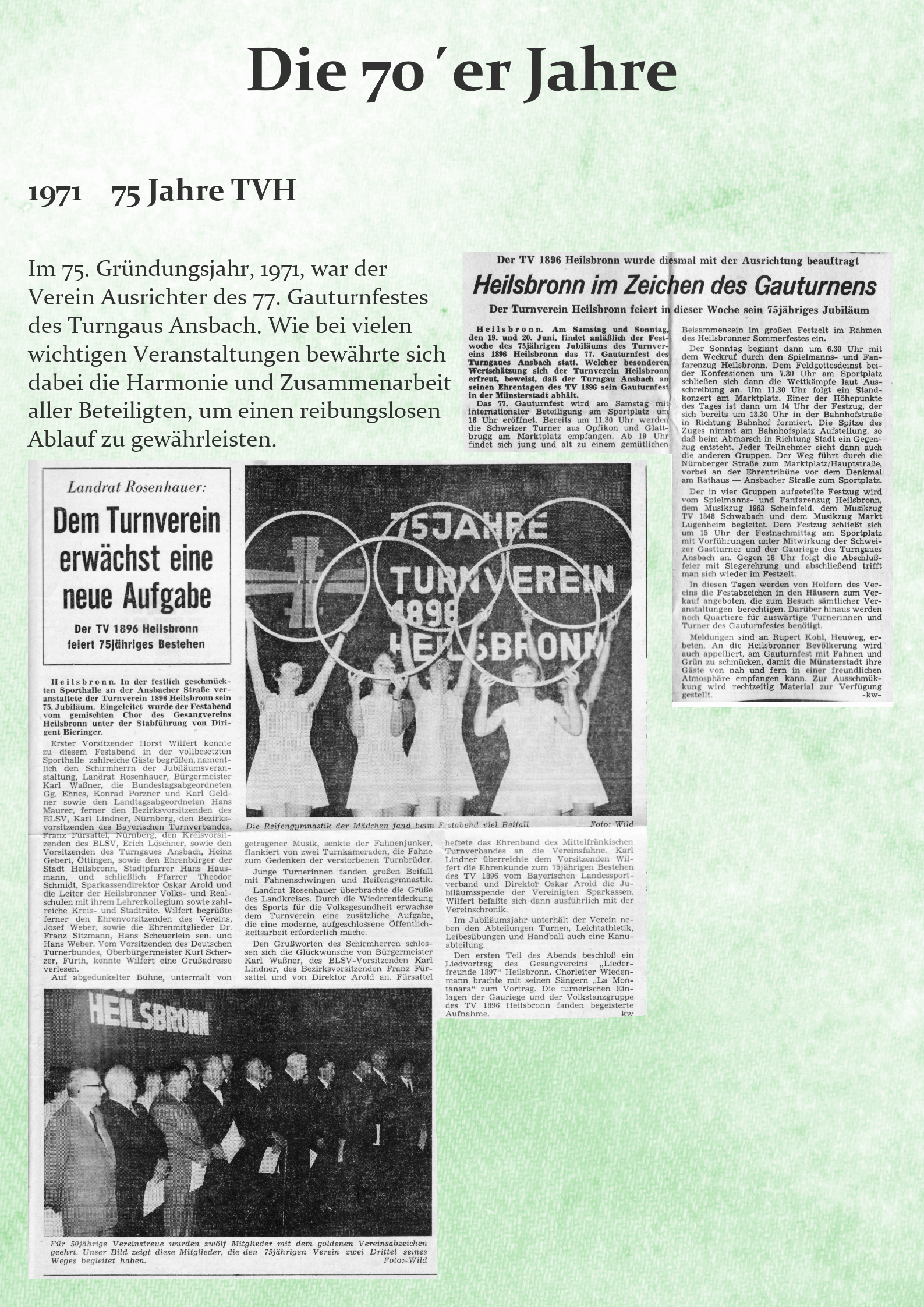 Im 75. Gründungsjahr, 1971, war der Verein Ausrichter des 77. Gauturnfestes des Turngaus Ansbach. Wie bei vielen wichtigen Veranstaltungen bewährte sich dabei die Harmonie und Zusammenarbeit aller Beteiligten, um einen reibungslosen Ablauf zu gewährleisten. Es gab natürlich auch aktive Teilnehmer unseres Turnvereins.