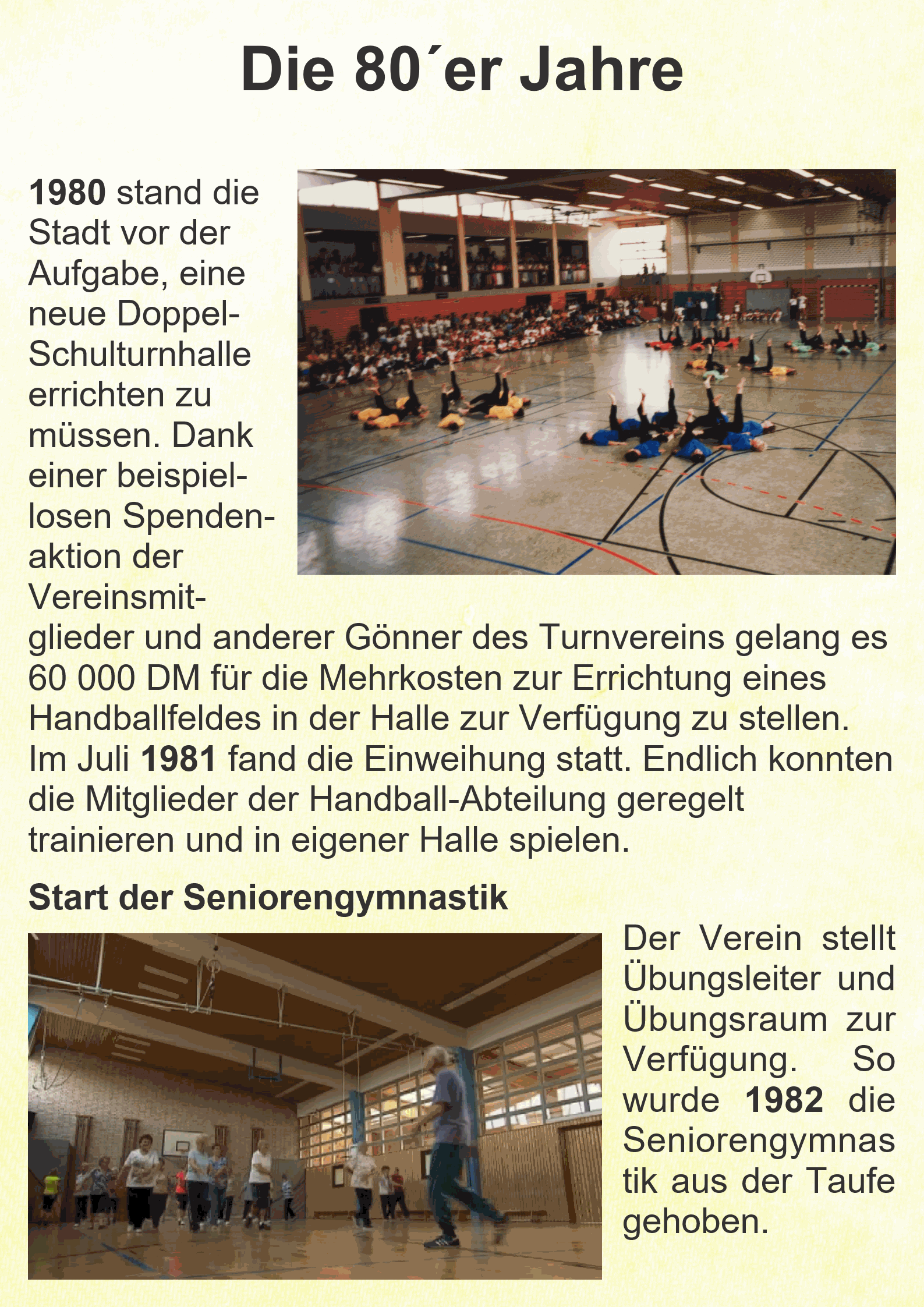 1980 stand die Stadt vor der Aufgabe, eine neue Doppel-Schulturnhalle errichten zu müssen. Dank einer beispiellosen Spendenaktion der Vereinsmitglieder und anderer Gönner des Turnvereins gelang es, 60 000 DM für die Mehrkosten zur Errichtung eines Handballfeldes in der Halle zur Verfügung zu stellen. Im Juli 1981 fand die Einweihung statt. Endlich konnten die Mitglieder der Handball-Abteilung geregelt trainieren und auch zu Hause spielen. Gleichzeitig wurde es möglich, mehr Übungsstunden in der kleinen Halle an der Grundschule unterzubringen.