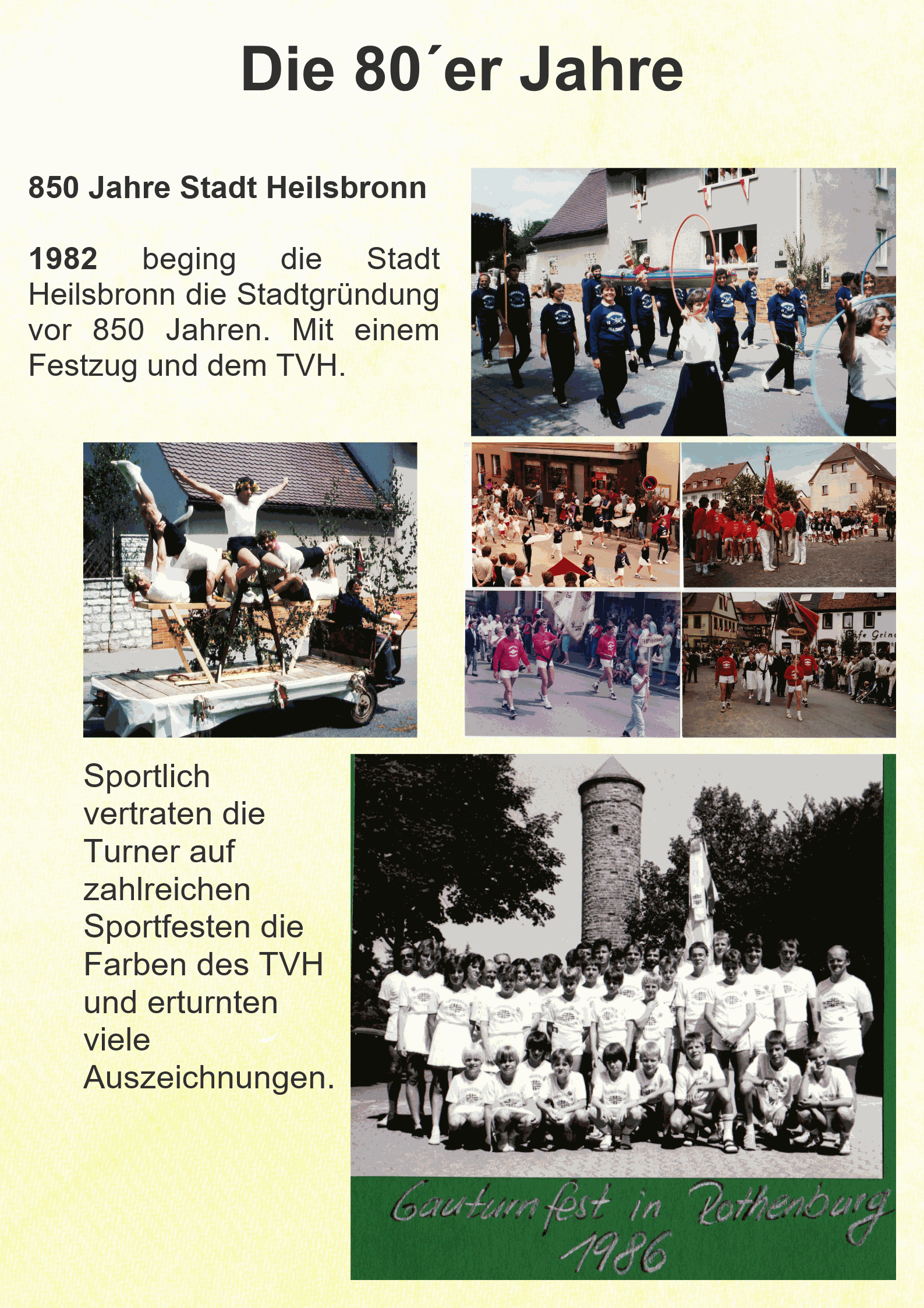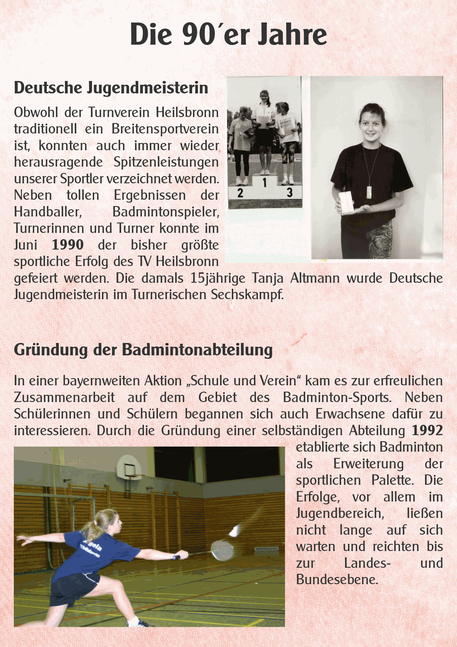 Obwohl der Turnverein Heilsbronn traditionell ein Breitensportverein ist, konnten auch immer wieder herausragende Spitzenleistungen unserer Sportler verzeichnet werden. Neben tollen Ergebnissen der Handballer, Badmintonspieler, Turnerinnen und Turner konnte im Juni 1990 der bisher größte sportliche Erfolg des TV Heilsbronn gefeiert werden. Die damals 15jährige Tanja Altmann wurde Deutsche Jugendmeisterin im Turnerischen Sechskampf - verdienter Lohn für erfolgreiches Training.