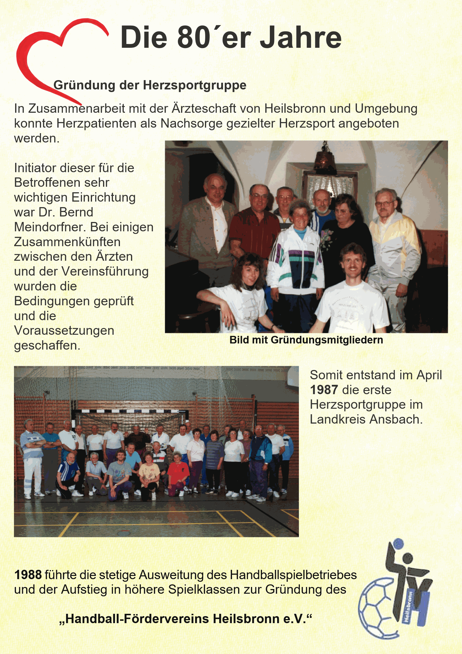 In Zusammenarbeit mit der Ärzteschaft von Heilsbronn und Umgebung konnte Herzpatienten als Nachsorge gezielter Herzsport angeboten werden. Initiator dieser für die Betroffenen sehr wichtigen Einrichtung war Dr. Bernd Meindorfner. Bei einigen Zusammenkünften zwischen den Ärzten und der Vereinsführung wurden die Bedingungen geprüft und die Voraussetzungen geschaffen. Somit entstand im April 1987 die erste Herzsportgruppe im Landkreis Ansbach.