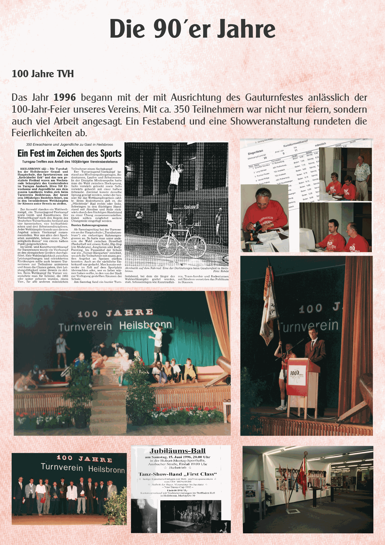 Das Jahr 1996 begann mit der mit Ausrichtung des Gauturnfestes anlässlich der 100-Jahr-Feier unseres Vereins. Mit ca. 400 Teilnehmern war nicht nur feiern angesagt, sondern wiederum halfen alle zusammen, um das Ereignis und die anfallende Arbeit zu bewältigen.