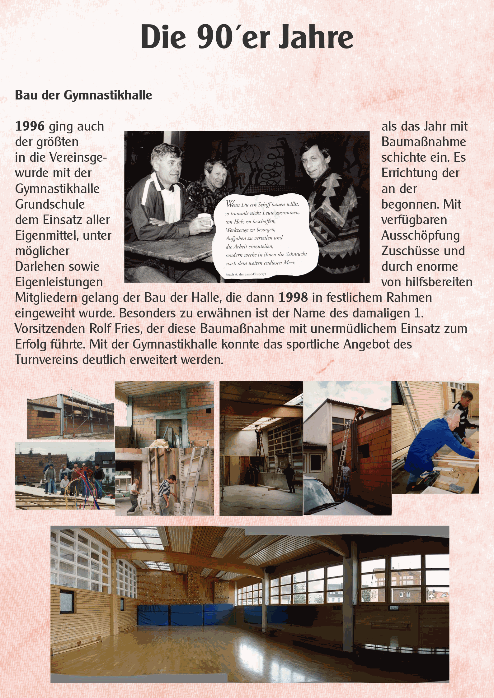 1996 ging auch als das Jahr mit der größten Baumaßnahme in die Vereinsgeschichte ein. Es wurde mit der Errichtung der Gymnastikhalle an der Grundschule begonnen. Mit dem Einsatz aller verfügbaren Eigenmittel, unter Ausschöpfung möglicher Zuschüsse und Darlehen sowie durch enorme Eigenleistungen von hilfsbereiten Mitgliedern gelang der Bau der Halle, die dann 1998 in festlichem Rahmen eingeweiht wurde. Besonders zu erwähnen ist der Name des damaligen 1. Vorsitzenden Rolf Fries, der diese Baumaßnahme mit unermüdlichem Einsatz zum Erfolg führte. Mit der Gymnastikhalle konnte das sportliche Angebot des Turnvereins deutlich erweitert werden. Die höchst erfolgreiche und beliebte Aerobic-Sparte verdankt ihre Geburtsstunde dieser Halle. Weitere Kurse für Tanz, Gymnastik und Gesundheitssport konnten angeboten werden.
