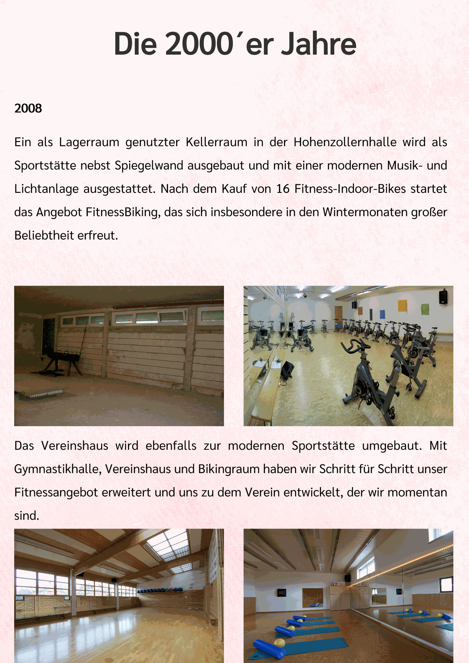 Im Jahr 2008 wurde ein als Lager genutzter Kellerraum in der Hohenzollernhalle vom Turnverein angemietet, zu einem tollen Fitnessraum ausgebaut, mit Licht- und Musikanlage, Spiegelwand und Lüftung versehen und schließlich mit Indoor-Bikes und weiteren Geräten ausgerüstet. Das neue Angebot FitnessBiking traf von Anfang an den Nerv der Zeit und erfreut sich großer Beliebtheit.