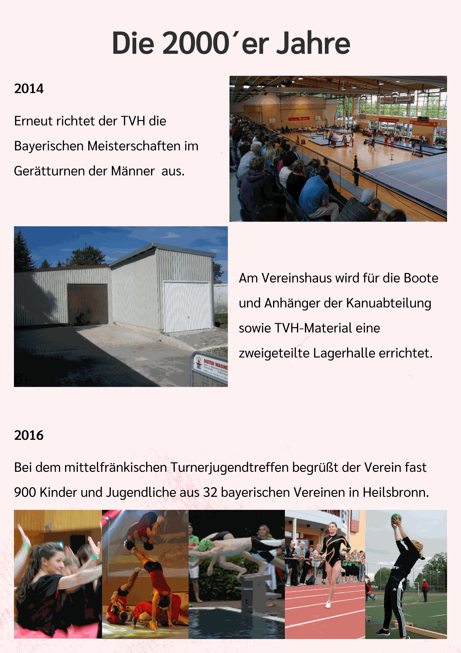 Im Jahr 2014 errichtete der Verein eine zweigeteilte Lagerhalle am Vereinshaus für die Boote und Anhänger der Kanuabteilung und für sonstiges TVH-Material. Im gleichen Jahr wurden erstmals hauptamtliche Sportlehrerinnen eingestellt, insbesondere für die Gründung der Kindersportschule KiSS, die Anfang 2016 den Betrieb aufnehmen konnte. Zur Entlastung der Sportstätten konnte 2017 ein ehem. Ladengeschäft in der Hauptstr. 2 von der Stadt angemietet und als Kampfsportstätte (Dojo) genutzt werden. Die Turner nahmen erstmals an der Landesliga teil, neben World Jumping und Reha-Sport wurde mit BigFit ein neues Angebot für stark übergewichtige Menschen aufgenommen.