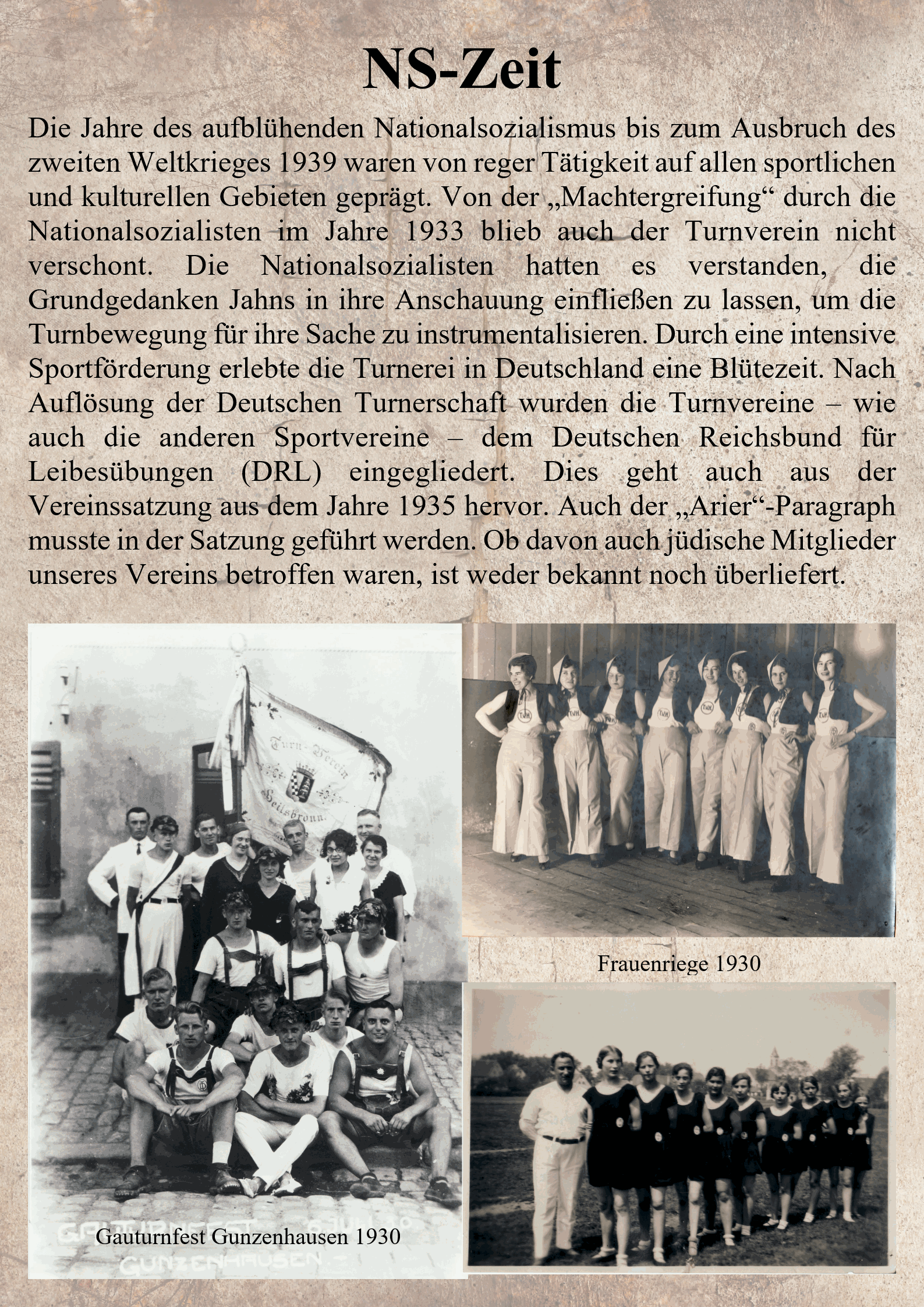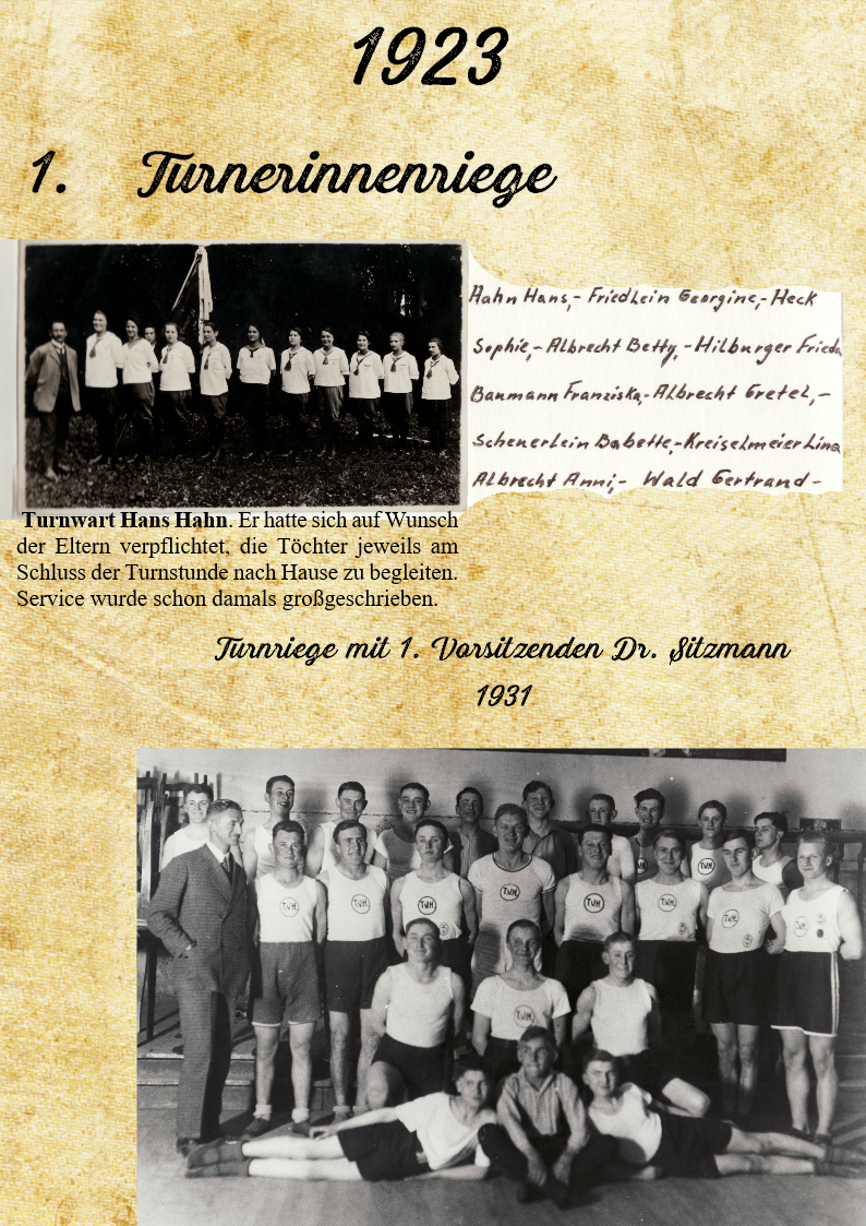 war aus Sicht der weiblichen Mitglieder ein historisches Jahr. Die Gründung einer Turnerinnenriege mit dem ersten Turnwart Hans Hahn. Er hatte sich auf Wunsch der Eltern verpflichtet, die Töchter jeweils am Schluss der Turnstunde nach Hause zu begleiten. Service wurde schon damals großgeschrieben.