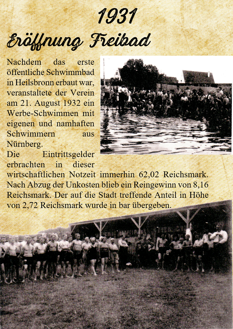 wurde Dr. Sitzmann zum 1. Vorsitzenden gewählt. Er verstand es, dem Verein Impulse zu geben, die weit über seine Amtszeit hinaus wirkten. Ähnlich wie Hans Hahn erwarb auch er sich einen Beinamen und wurde respektvoll "unser Master" genannt. Ihm gelang es, in der Zeit der größten Arbeitslosigkeit 1932 einen freiwilligen Arbeitsdienst zur Sportplatzrenovierung ins Leben zu rufen. Nachdem das erste öffentliche Schwimmbad in Heilsbronn erbaut war, veranstaltete der Verein am 21. August 1932 ein Werbe-Schwimmen mit eigenen und namhaften Schwimmern aus Nürnberg. Die Eintrittsgelder erbrachten in dieser wirtschaftlichen Notzeit immerhin 62,02 Reichsmark. Nach Abzug der Unkosten blieb ein Reingewinn von 8,16 Reichsmark. Der auf die Stadt treffende Anteil in Höhe von 2,72 Reichsmark wurde in bar übergeben.
