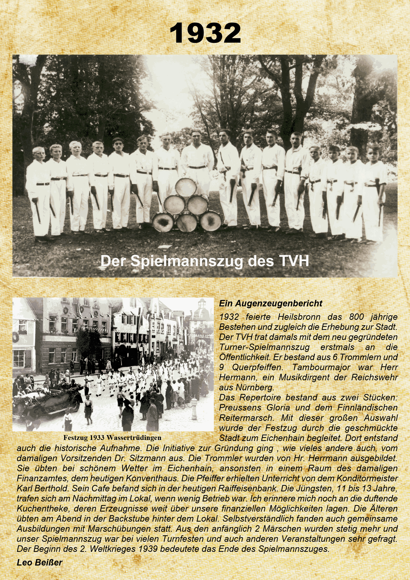 trat ein Mann als Turner in das Rampenlicht des Vereins, der die Vereinsgeschichte geprägt hat: Der 20jährige Hans Weber. Im Lauf seiner späteren Vereinskarriere war er mit unterschiedlichsten Aufgaben betraut. Er wurde zum "Turnvater" des TV Heilsbronn.