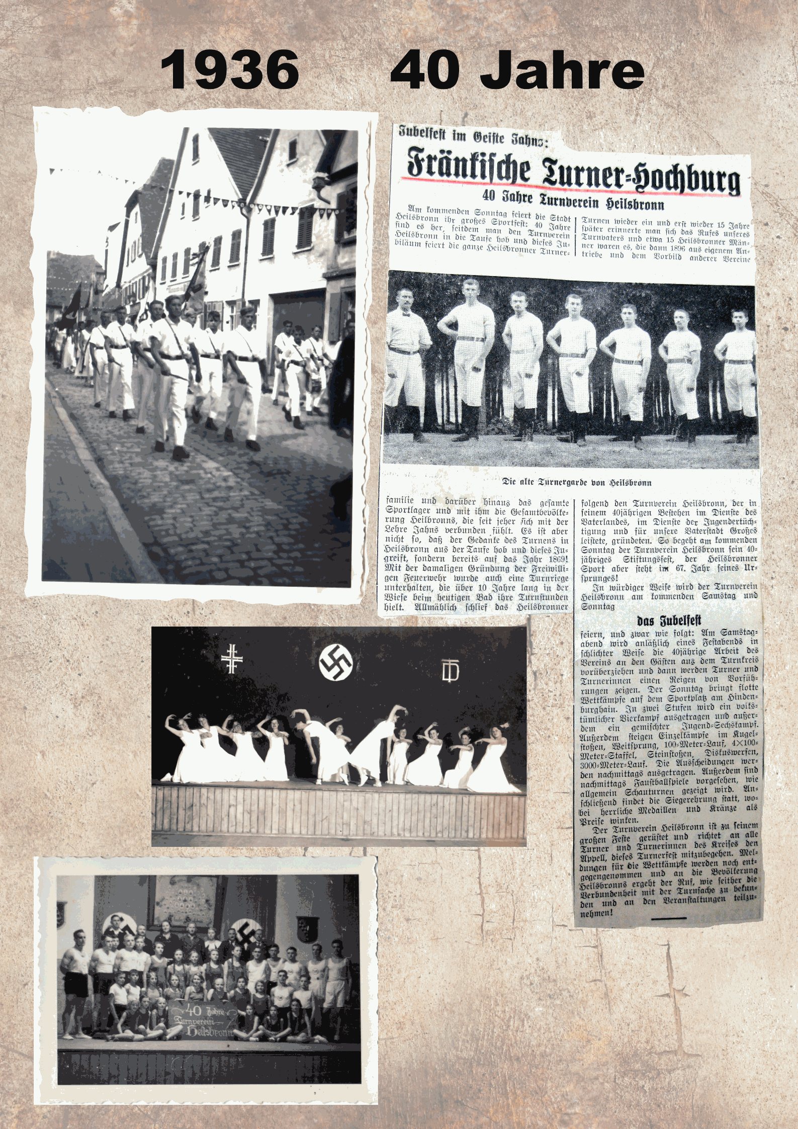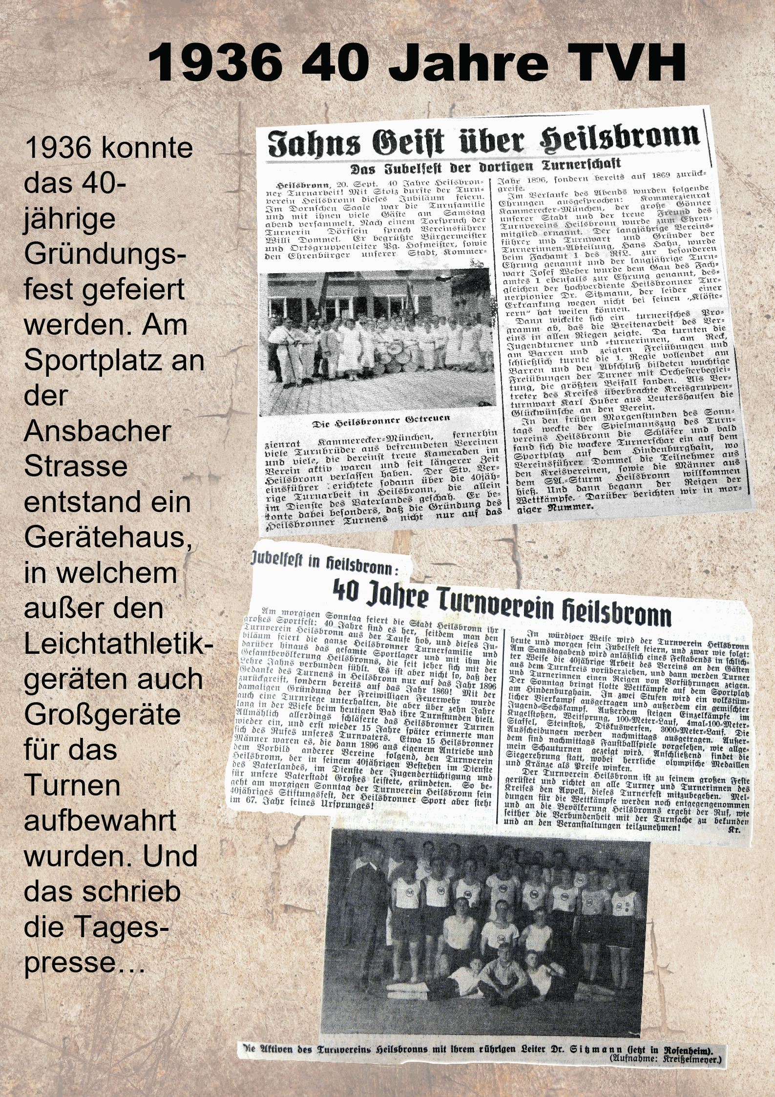 1936 konnte das 40jährige Gründungsfest gefeiert werden und am Sportplatz entstand ein Gerätehaus, in welchem außer den Leichtathletikutensilien auch Großgeräte für das Turnen aufbewahrt wurden.